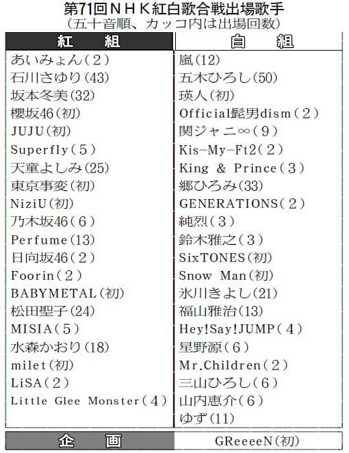 写真 第71回 紅白歌合戦出場歌手一覧表 中日スポーツ 東京中日スポーツ
