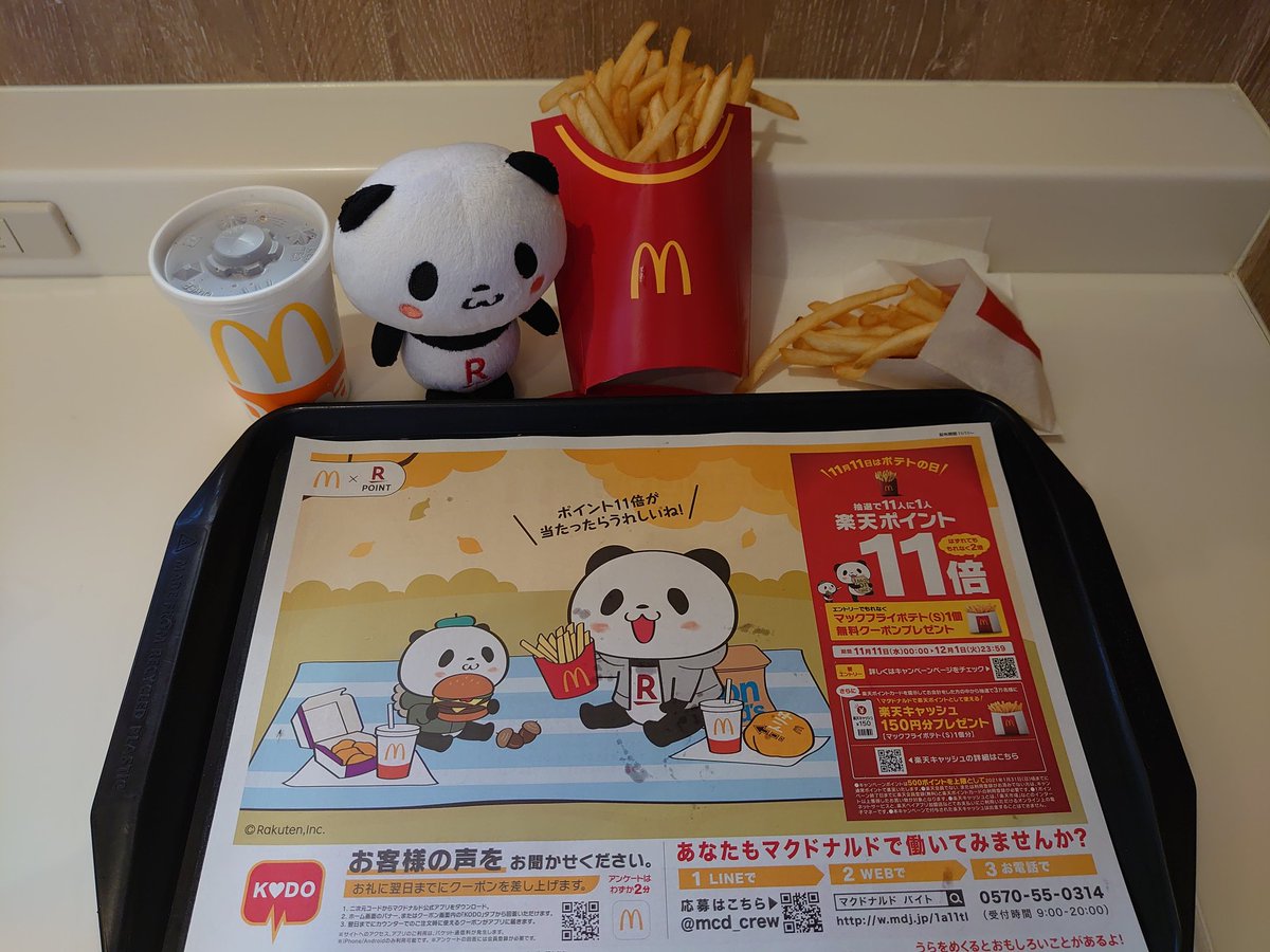 ট ইট র リーダー マクドナルドなう 新作トレイシートを早速ゲット ポテトを置かれて汚れたので別で綺麗なのを数枚いただきました ポテト Sも楽天ポイントカードのおかげで無料ゲット お買いものパンダ マクドナルド トレイシート
